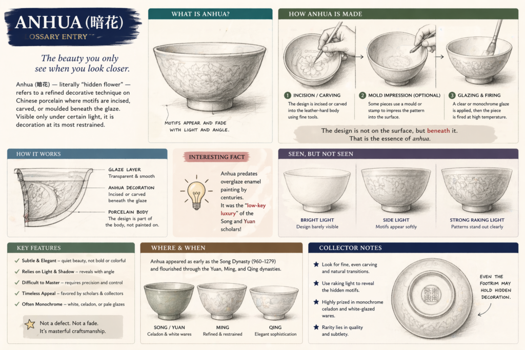 Anhua (暗花) — literally “hidden flower” — refers to a refined decorative technique where motifs are incised, carved, or moulded beneath the glaze, becoming visible only under certain light.