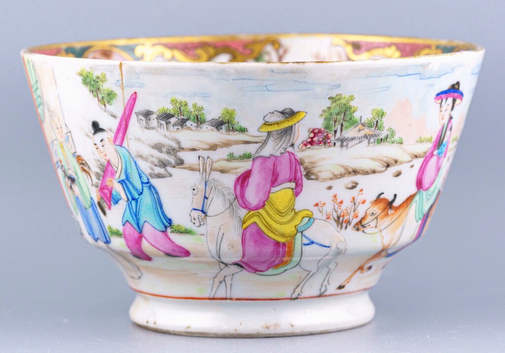 By the nineteenth century, famille rose had become the most familiar palette of Chinese porcelain abroad. Export wares for Europe and America often sacrificed refinement for boldness: thick enamels, busy scenes, and heavily gilded borders.