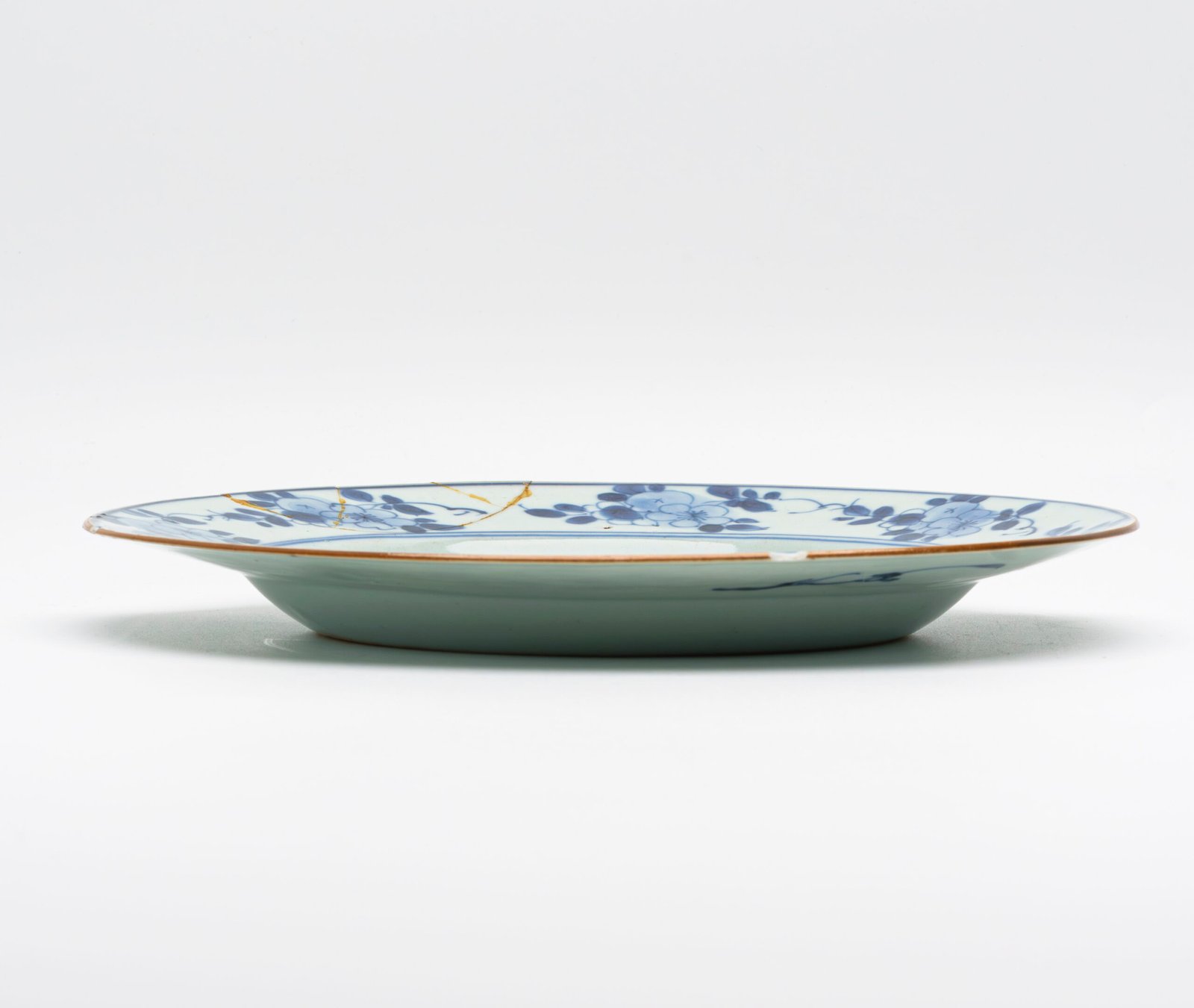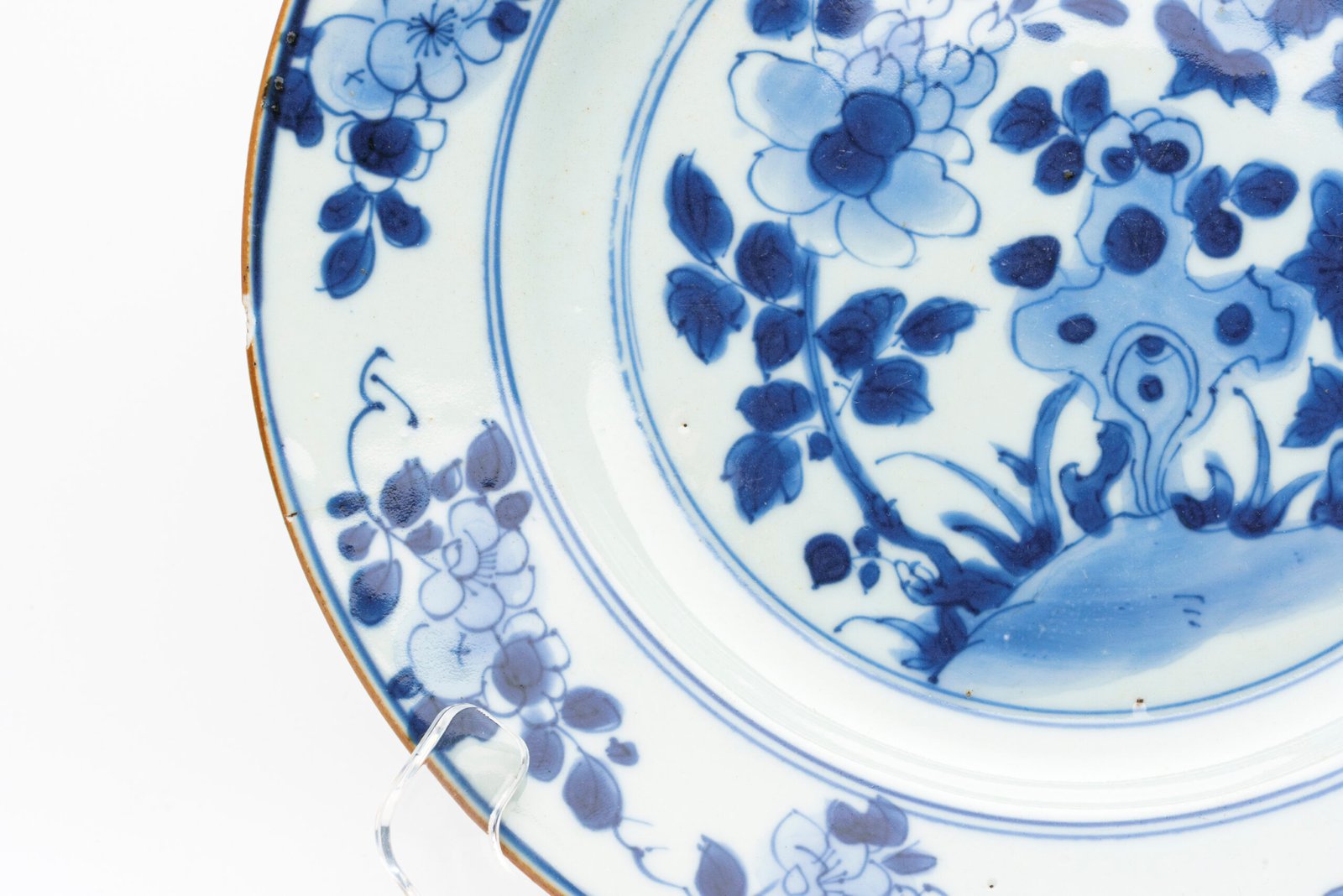 Chinese Kangxi Porcelain Plate Blue White Peony Blossom Rock Brown Rim Qing 18C