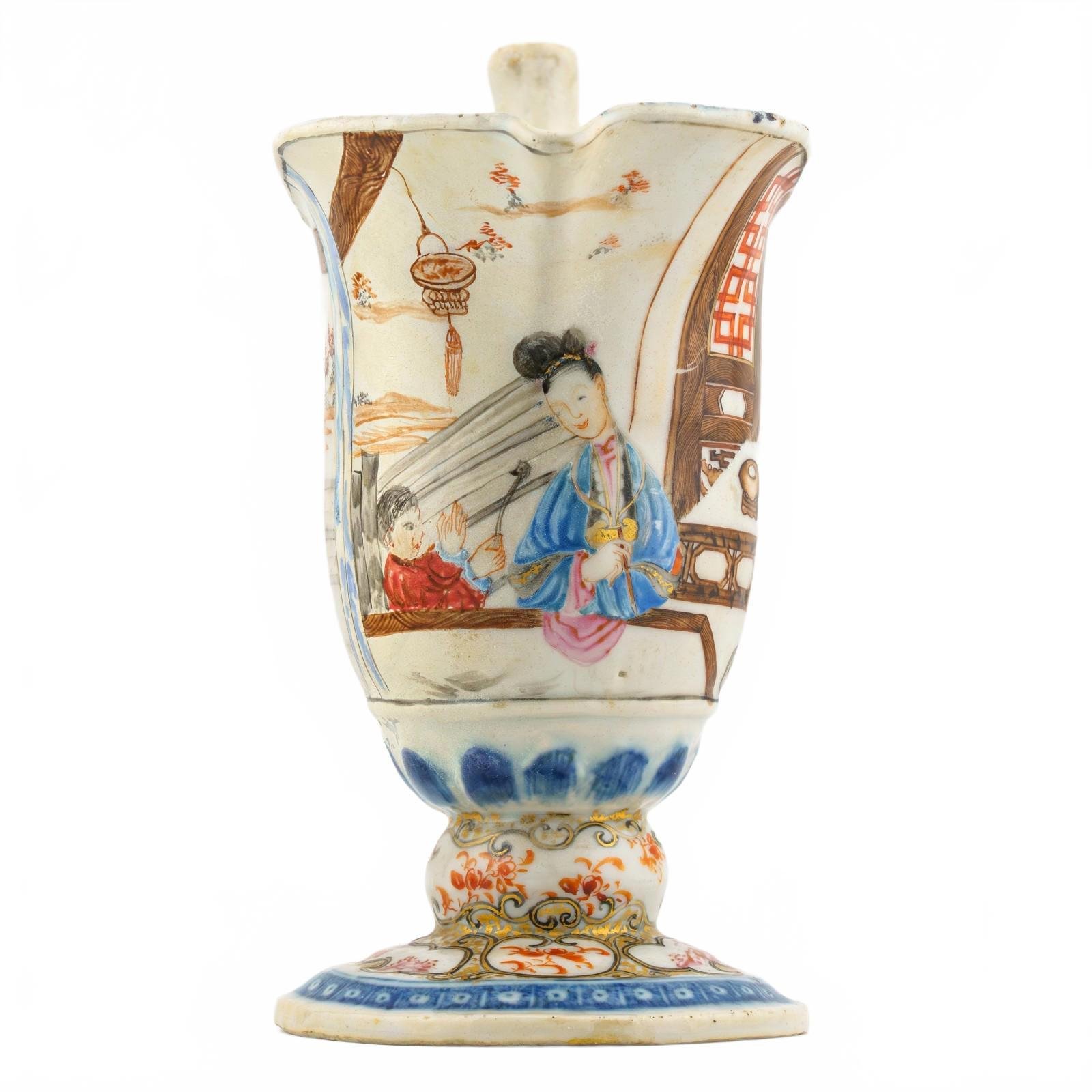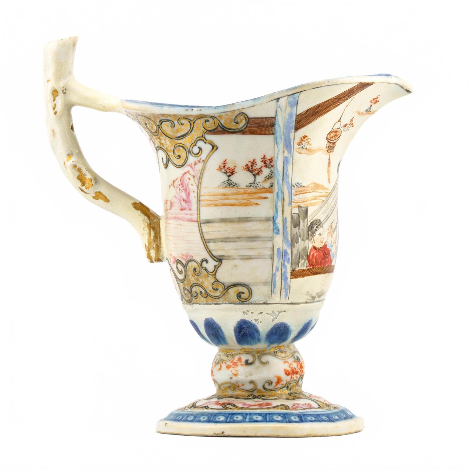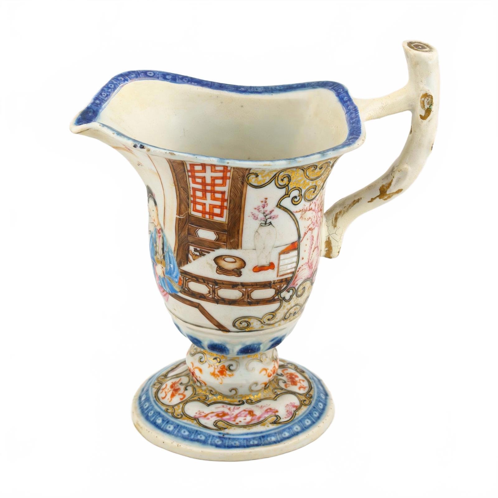 📜 Description This elegant Chinese Porcelain footed Mandarin Jug dates to the Qianlong period of the Qing Dynasty. Finely painted in vibrant Famille Rose enamels, the body is decorated with detailed interior scenes of refined Mandarin Figures, architectural elements, and furnishings framed by delicate gilt scrollwork borders. The jug features a shaped spout, applied branch-form handle with gilded accents, and a pedestal foot richly ornamented with polychrome enamels and gilt decoration. Collector’s Notes: Export wares with Mandarin figure decoration were highly prized in the 18th century for European markets. Pieces from the Qianlong era are especially admired for their refined painting, lively narrative scenes, and decorative richness, making them desirable among collectors of Qing Dynasty porcelain.