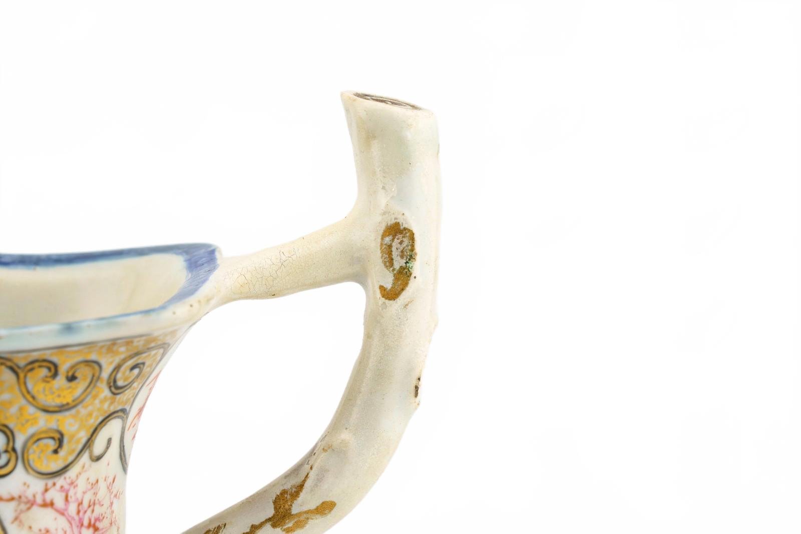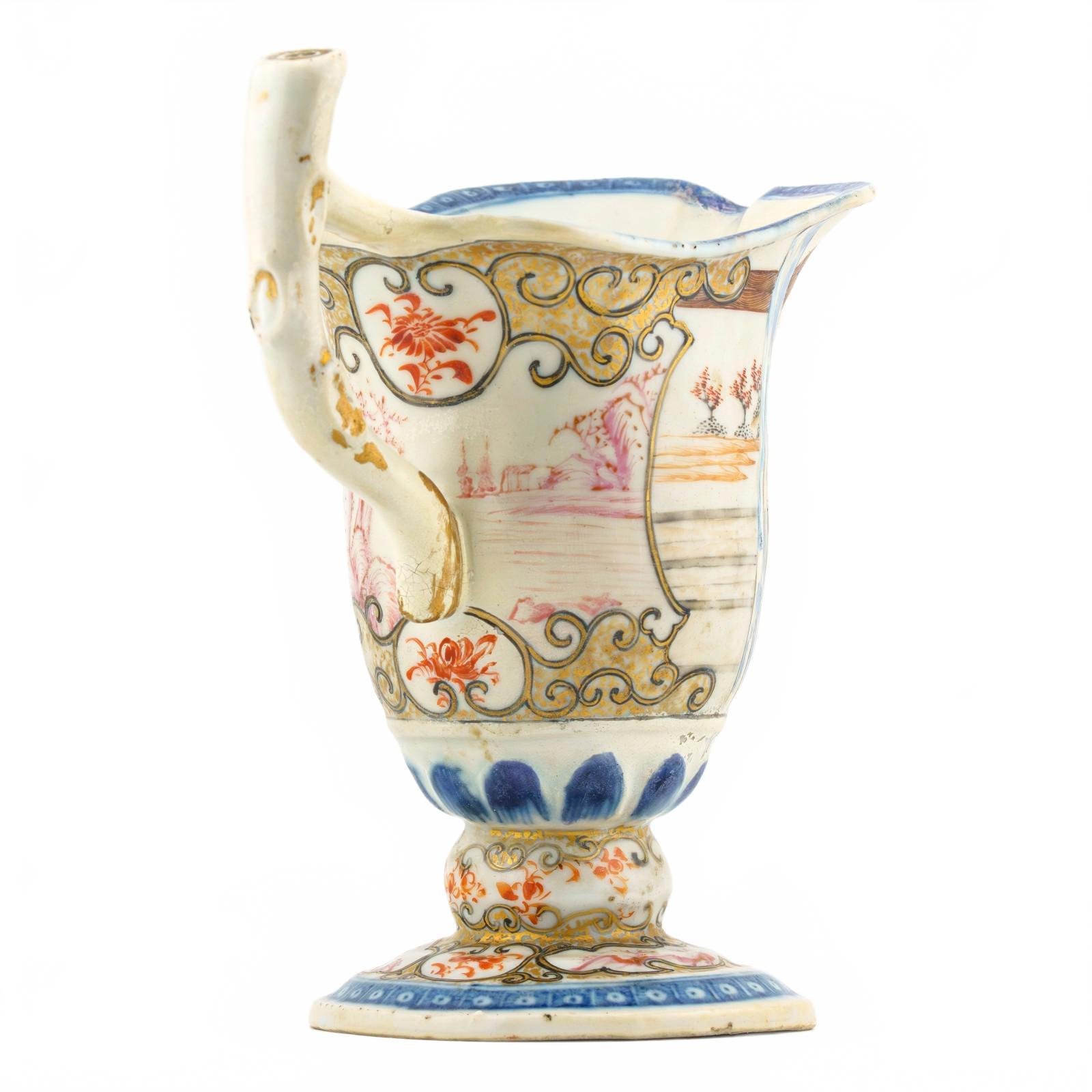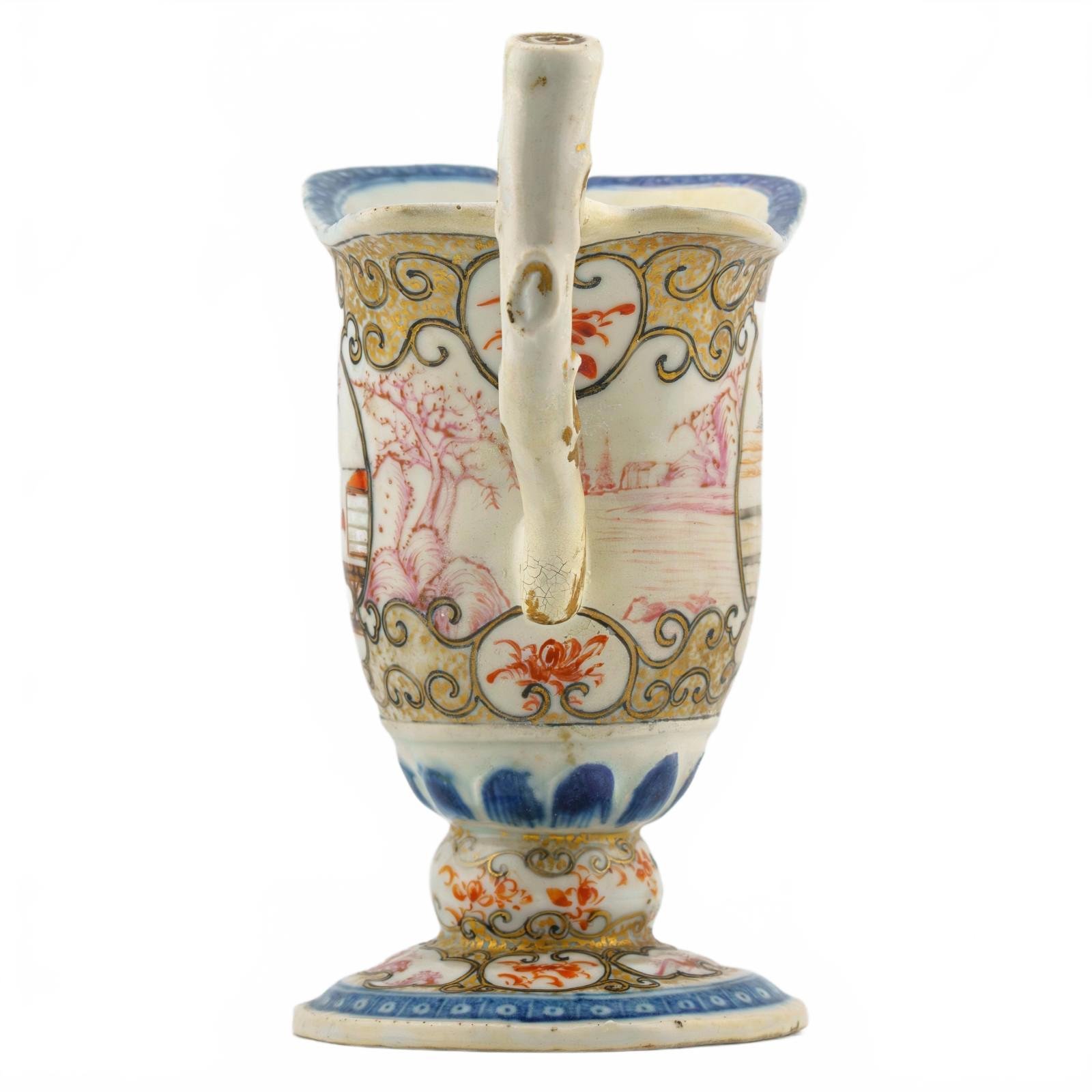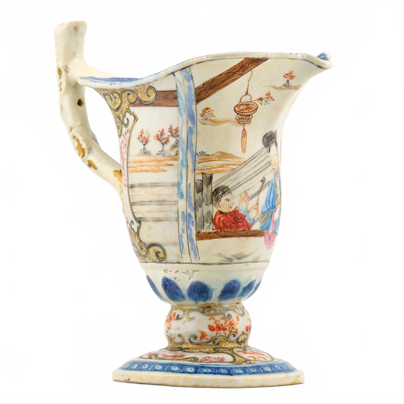 📜 Description This elegant Chinese Porcelain footed Mandarin Jug dates to the Qianlong period of the Qing Dynasty. Finely painted in vibrant Famille Rose enamels, the body is decorated with detailed interior scenes of refined Mandarin Figures, architectural elements, and furnishings framed by delicate gilt scrollwork borders. The jug features a shaped spout, applied branch-form handle with gilded accents, and a pedestal foot richly ornamented with polychrome enamels and gilt decoration. Collector’s Notes: Export wares with Mandarin figure decoration were highly prized in the 18th century for European markets. Pieces from the Qianlong era are especially admired for their refined painting, lively narrative scenes, and decorative richness, making them desirable among collectors of Qing Dynasty porcelain.