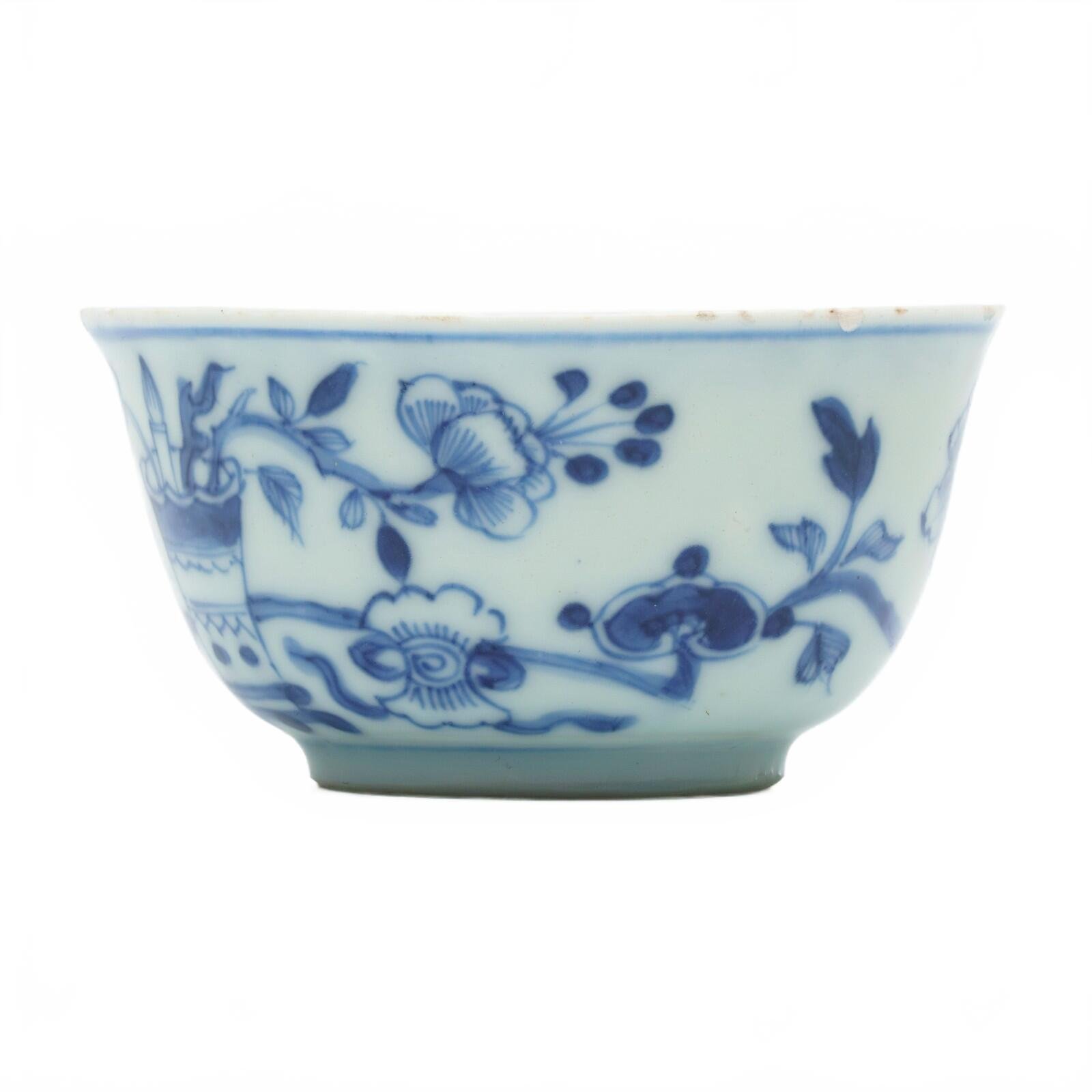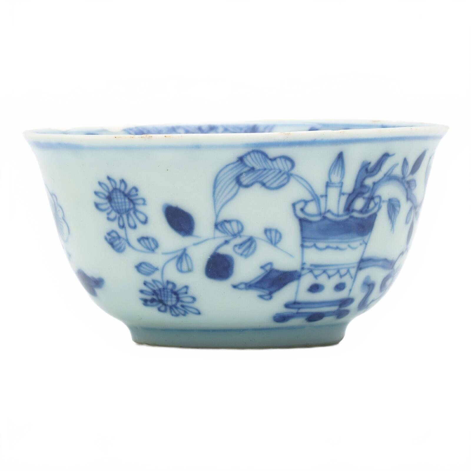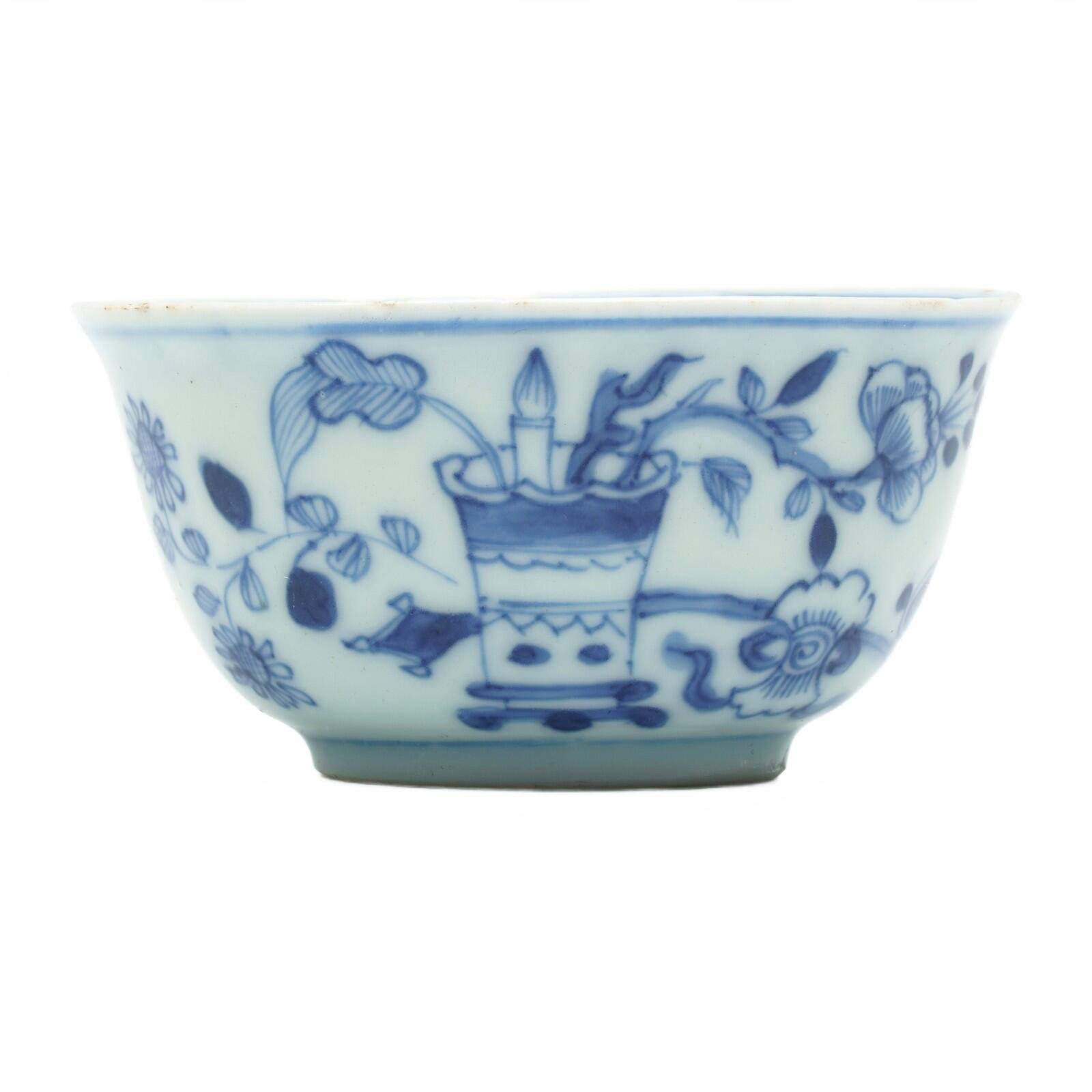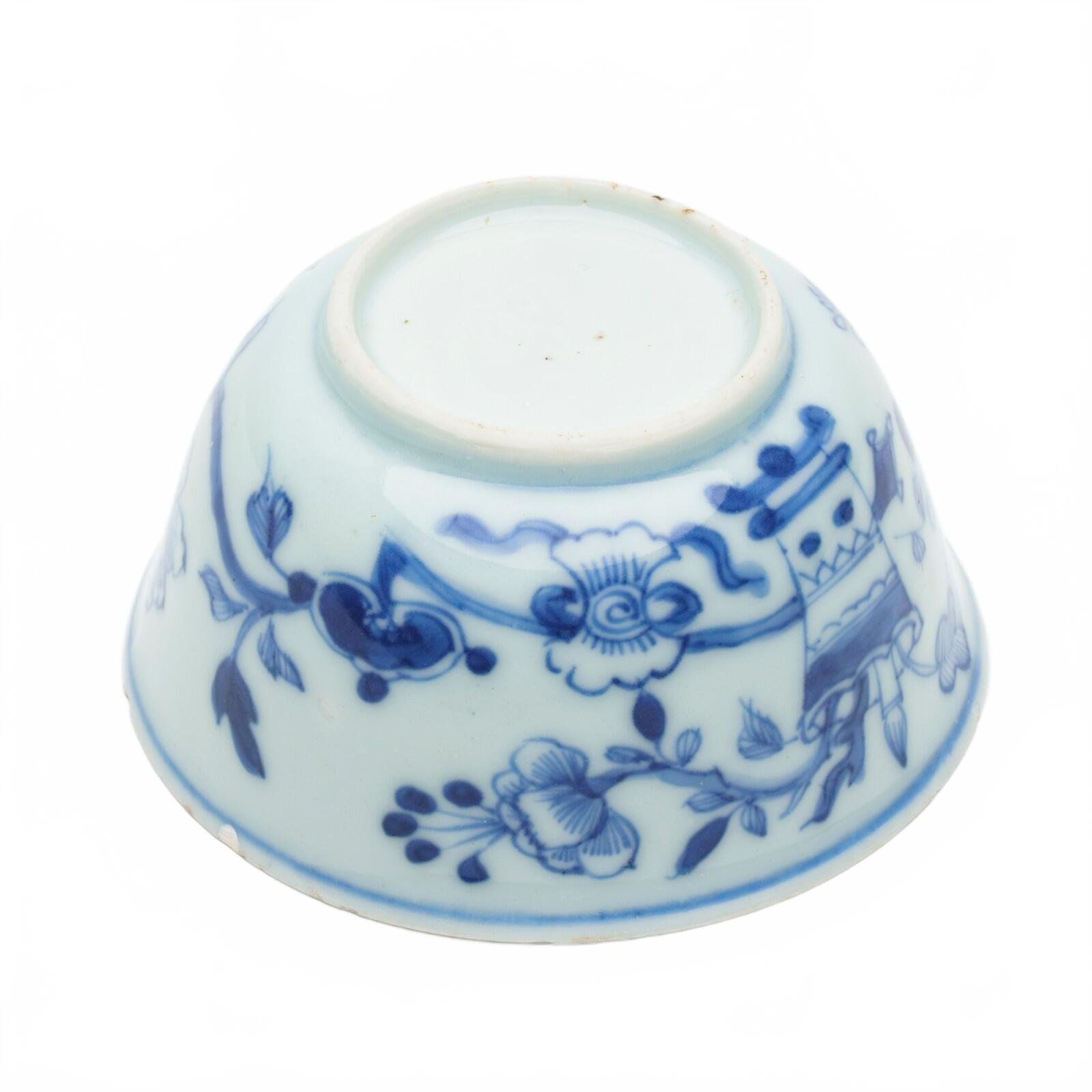🆔 Inventory Code    INV4029 Ⓜ️ Material   Porcelain 🏳️ Origin   China 🏛️ Period   Qianlong – 18th Century 🅂 Subject   Precious Objects – Ruyi Scepter, Brush Pot, Feather, Axe, Floral Scrolls 🏷️ Marked   Unmarked 📜 Description Fine Chinese Blue & White Porcelain bowl dating to the Qianlong period of the Qing Dynasty. The exterior is delicately painted with a continuous scroll of Precious Objects, including a Ruyi Scepter, Brush Pot, feather, axe and stylized Floral motifs, symbolizing scholarly refinement and auspicious blessings.