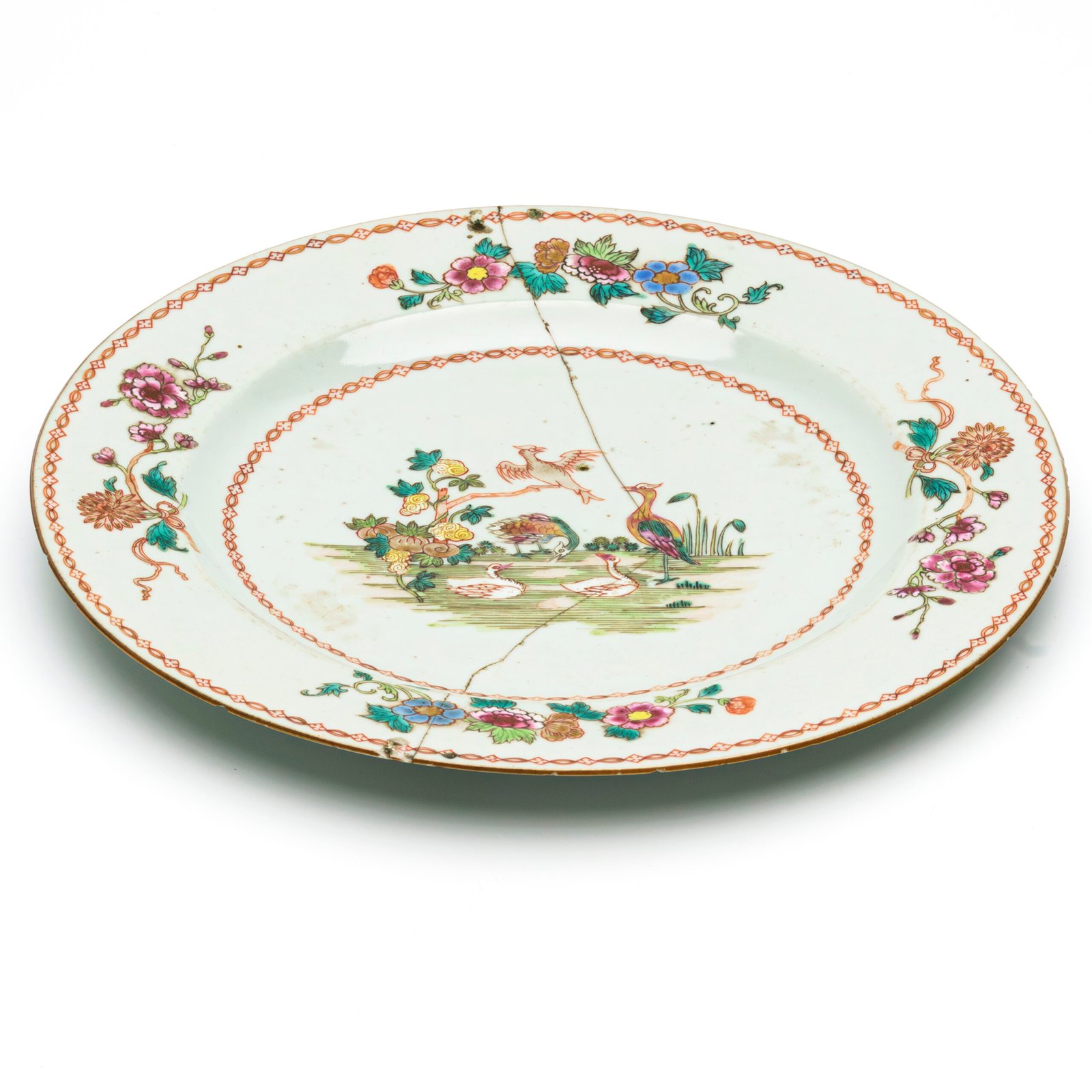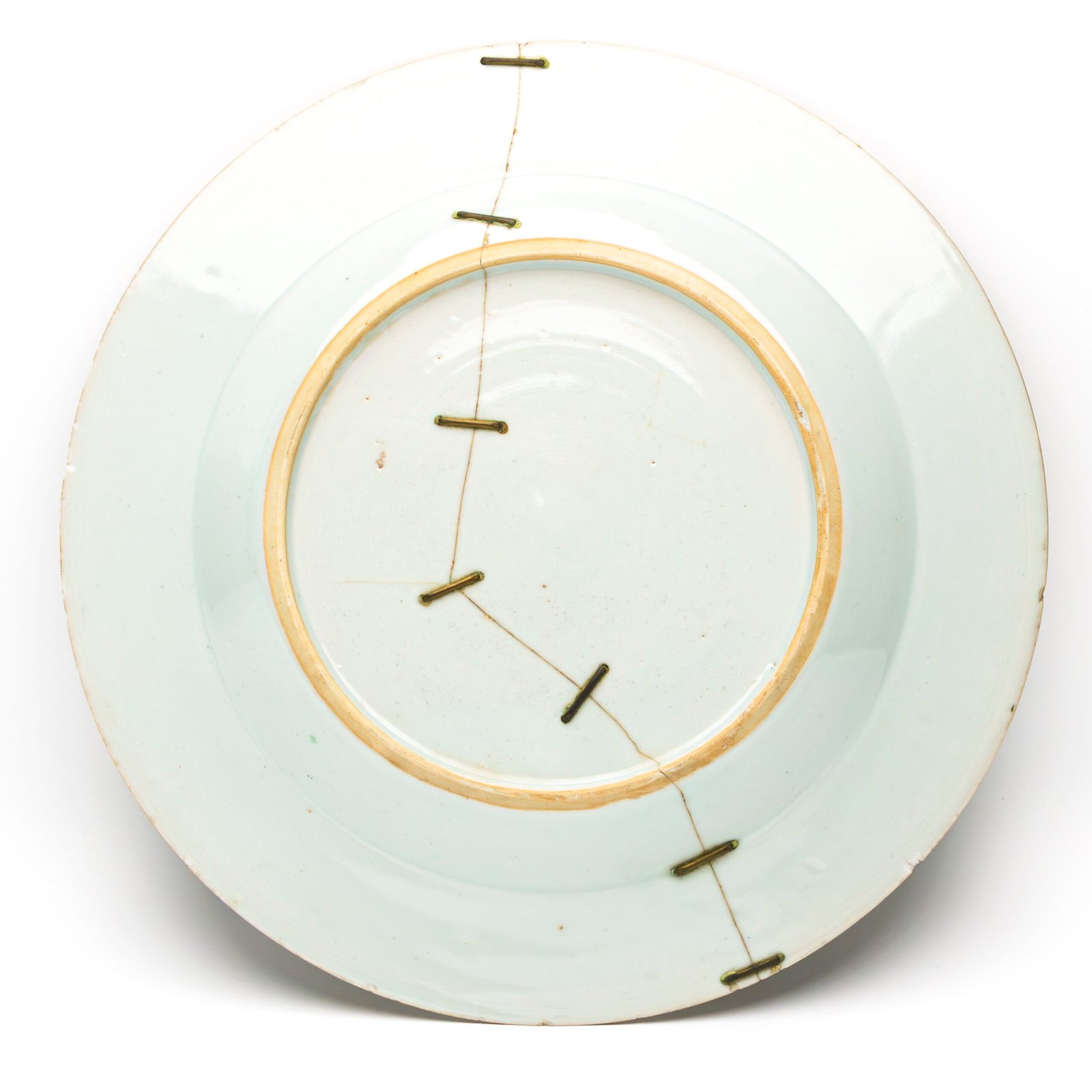 | 📜 Description | Chinese Porcelain plate decorated in Famille Rose enamels on a pale aqua ground. The central medallion depicts a lively bird scene with ducks and exotic birds among flowering plants in a waterside setting. The cavetto and rim are embellished with floral sprays and delicate gilt chain borders, typical of Qianlong export porcelain. The refined color palette and balanced composition reflect the elegance of the Qing Dynasty decorative tradition. Collector’s Notes: This piece forms part of a larger family-held group of similar plates. Famille Rose export wares from the Qianlong period were highly sought after in Europe during the 18th Century, prized for their vibrant enamels and intricate gilt decoration. The bird-and-flower motif symbolizes harmony and prosperity, enhancing its appeal to collectors. |