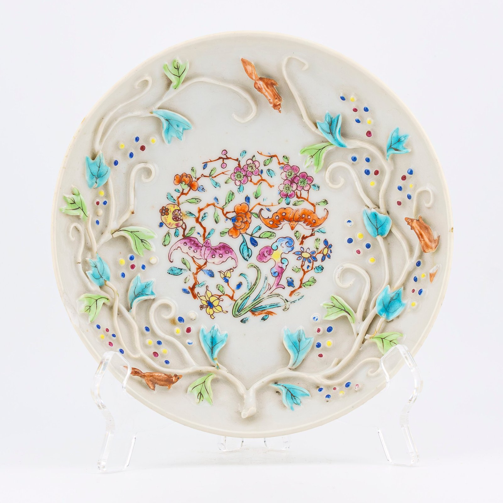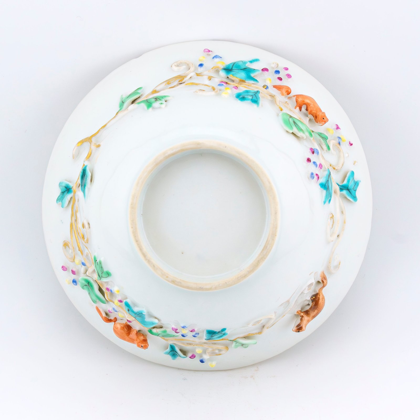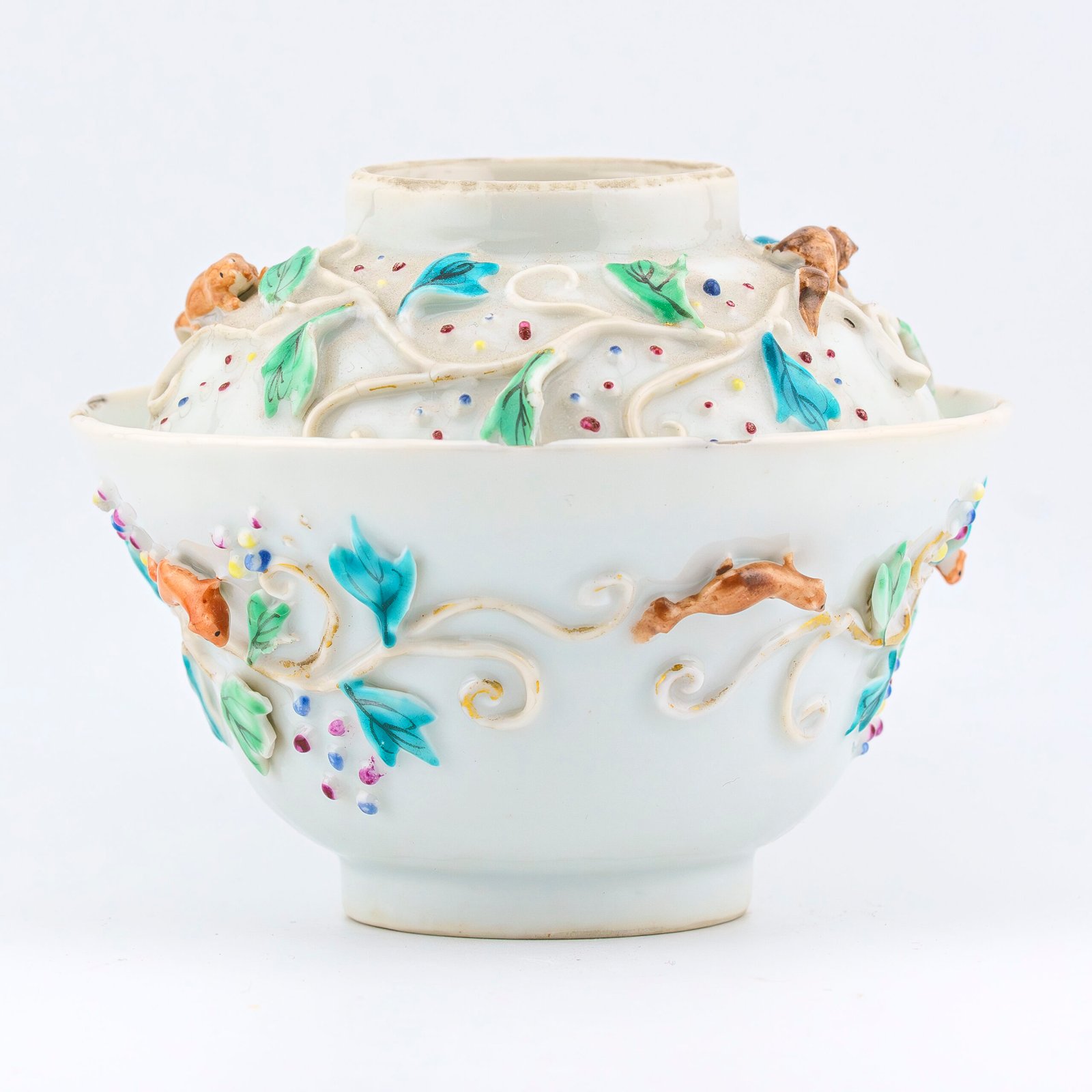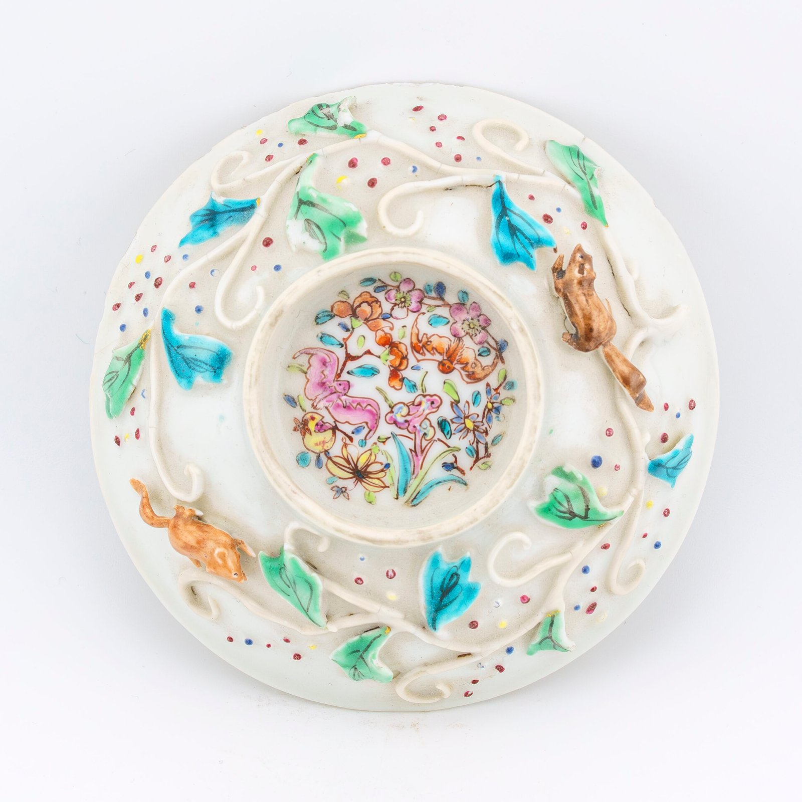 🅂 Subject Famille Rose floral painting with applied relief squirrels and scrolling branches